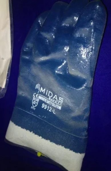 ize 8 Inches Usage/Application Electrical protection Color Blue Brand Midas Pattern Plain Gender Unisex Product Material Leather Essentially, this sort of work glove is achieved by dipping the glove into a Nitrile polymer coating, which covers the palm and the fingers. This precise method of dipping gloves results in a seamlessly coated glove